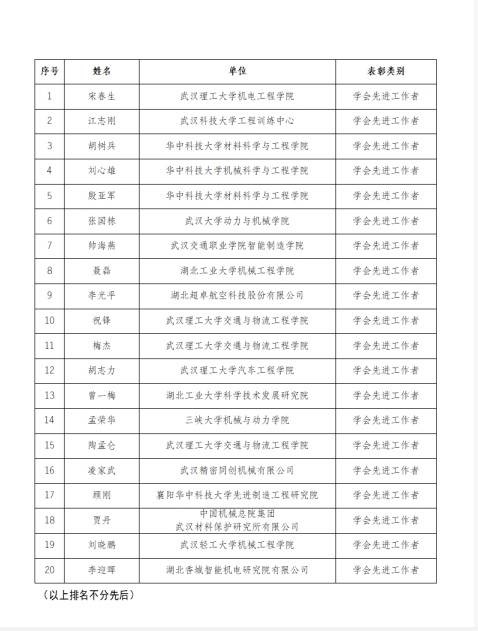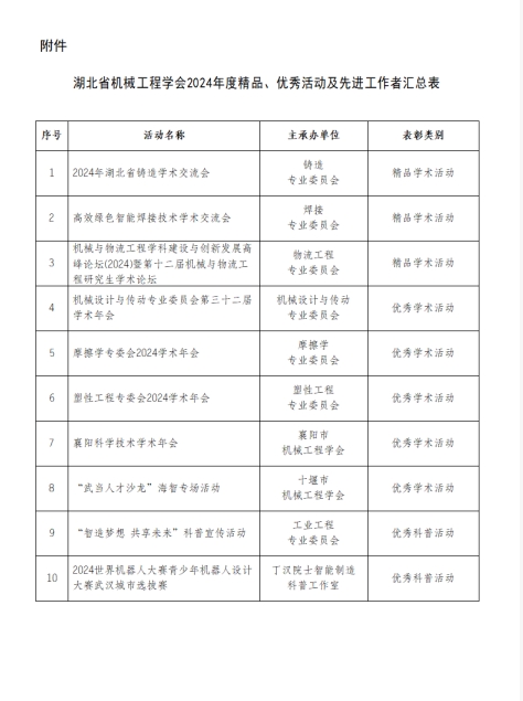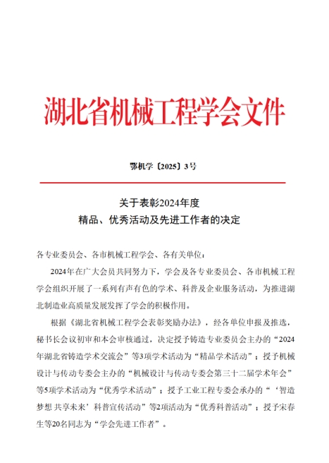 湖北省機械工程學(xué)會關(guān)于表彰2024年度學(xué)會精品、優(yōu)秀活動及先進(jìn)工作者的決定。