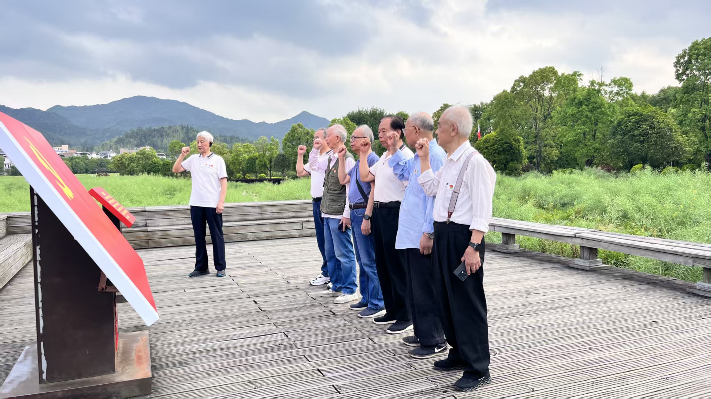 七位老學會工作者、老黨員在古田會議會舊址前重溫入黨誓詞,再一次向黨宣誓。