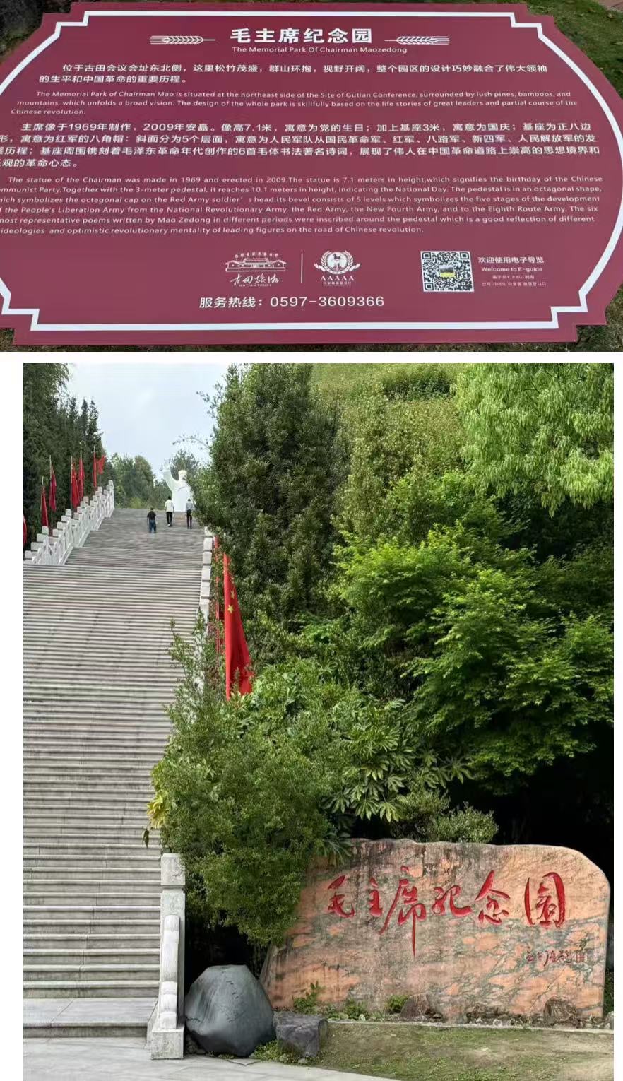 古田會議會址東北側的毛主席紀念園可以讓我們緬懷毛主席的豐功偉績、了解他波瀾壯闊一生的圣地。毛主席紀念園是2009年古田會議勝利召開80周年之際,當?shù)匕傩蘸驼疄榱吮磉_對毛主席的感激和懷念之情選址修建的。